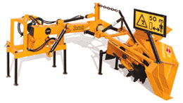 This device enables the excavation and maintenance of ditches set laterally with respect to the tractor. During the transport phase, the ditcher is positioned vertically. The lateral device can also be supplied individually for mounting on any type of ditcher. Motion is transmitted via cardan shafts. There are two models available: one makes it possible to work at a distance of 160 cm and the other at a distance on 240 cm from the center of the tractor to the center of the excavated ditch. D O N D I -salaojajyrsimet
