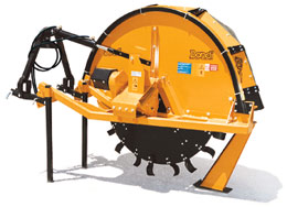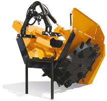 DONDIDRENAG is effective on any type of rock-free soil to open drainage ditches and lay drainage and irrigation pipes, electrical and telephone cables, and pipes for water mains with a maximum diameter of 150 mm. DONDIDRENAG is used on the three-point hitch of any type of any type of tractor with wheels with creep speeds of 0.35 / 0.65 km/h and is driven by a power takeoff at 540 and 1000 rpm. The work dept is adjusted via hydraulic hoist of the dractor and a hydraulic jack on the DRENAG performs the startup operation until the desired depth is achieved. The different cutting widths are obtained simply by inverting the position of the blades on the 8- and 14-cm rotor disk and with a kit of pads to bring the width to 20 cm on models 75/100 and 100/120. The excavated soil can be removed laterally or can be left near the ditch to fill it after the pipes have been laid. On request, the drenag 75/100 and 100/120 can be outfitted with a complete kit for dereeling pipes and/or cables while the ditching is under way. DONDIDRENAG is delivered complete with a Cardan shaft, safety clutch and and third-point hydraulic hitch in the 75/100 and 100/120 models. When working with hard and rocky soils, the machine can also be equipped with tools with tungsten bits. D O N D I -lautasmuokkaimet